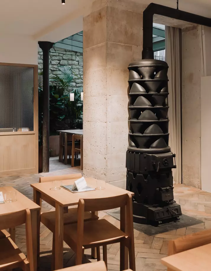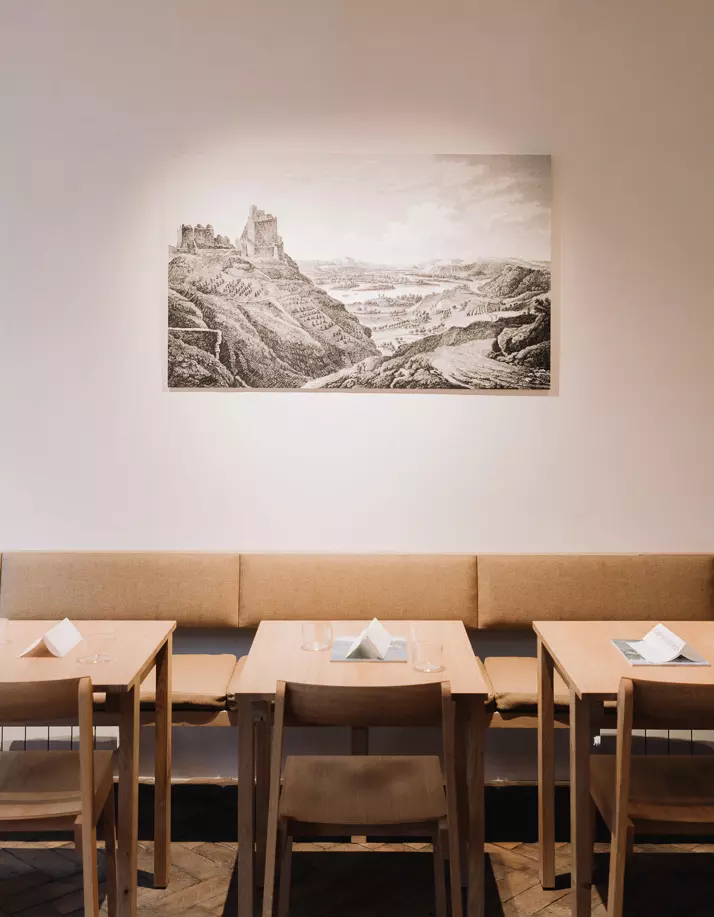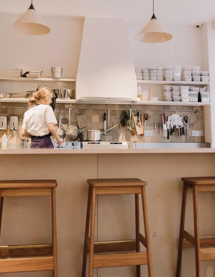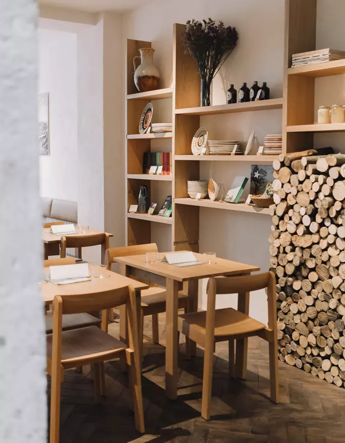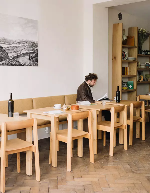 Camille Besse the interior architect combined the Blueprint Chair and the Angle Bar Stool with tables and extra furniture in oak designed and manufactured by herself.
