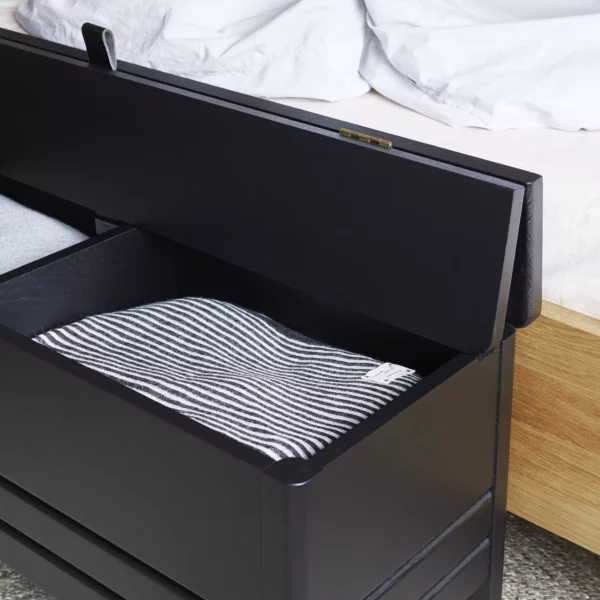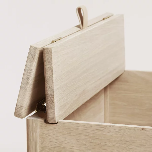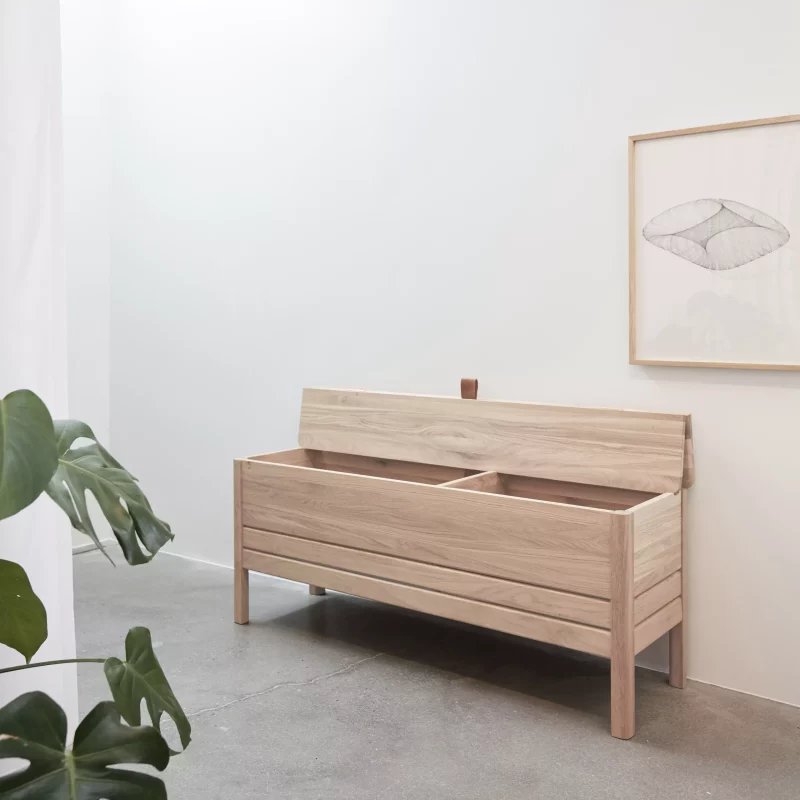 A highlight of our collection is the bestselling A Line Storage Bench. This oak storage bench offers practical utility with its generous storage space, divided into two separate compartments. The lid can be lifted using a small leather handle and is securely held in place by its design when in use. This bench is both visually appealing and practical for everyday use. The A Line Storage Bench is available in both a small and a large size, with finishes including white oak, traditional oak, indigo blue, and black. Its clean lines and storage solution make it ideal as a standalone piece or as part of a seating arrangement.