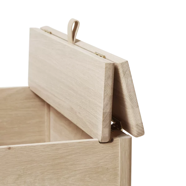 A Line Storage Bench is an updated version of the classic storage bench – where functionality meets clean form. A solid and versatile bench with slightly reduced dimensions and minimalistic characteristics. It is practical with a large area for storage – consisting of two separated compartments. The lid is lifted via a small leather handle and is held in place by the construction when in use. The lower cut of the two legs angles the piece so as to give it a feeling of being lifted up making the overall design solid and robust, but also stylish. A versatile oak storage bench either as a stand-alone item in a hallway, bedroom, or any seating area – to embellish practical areas in the home and to ensure joy of use and storage.