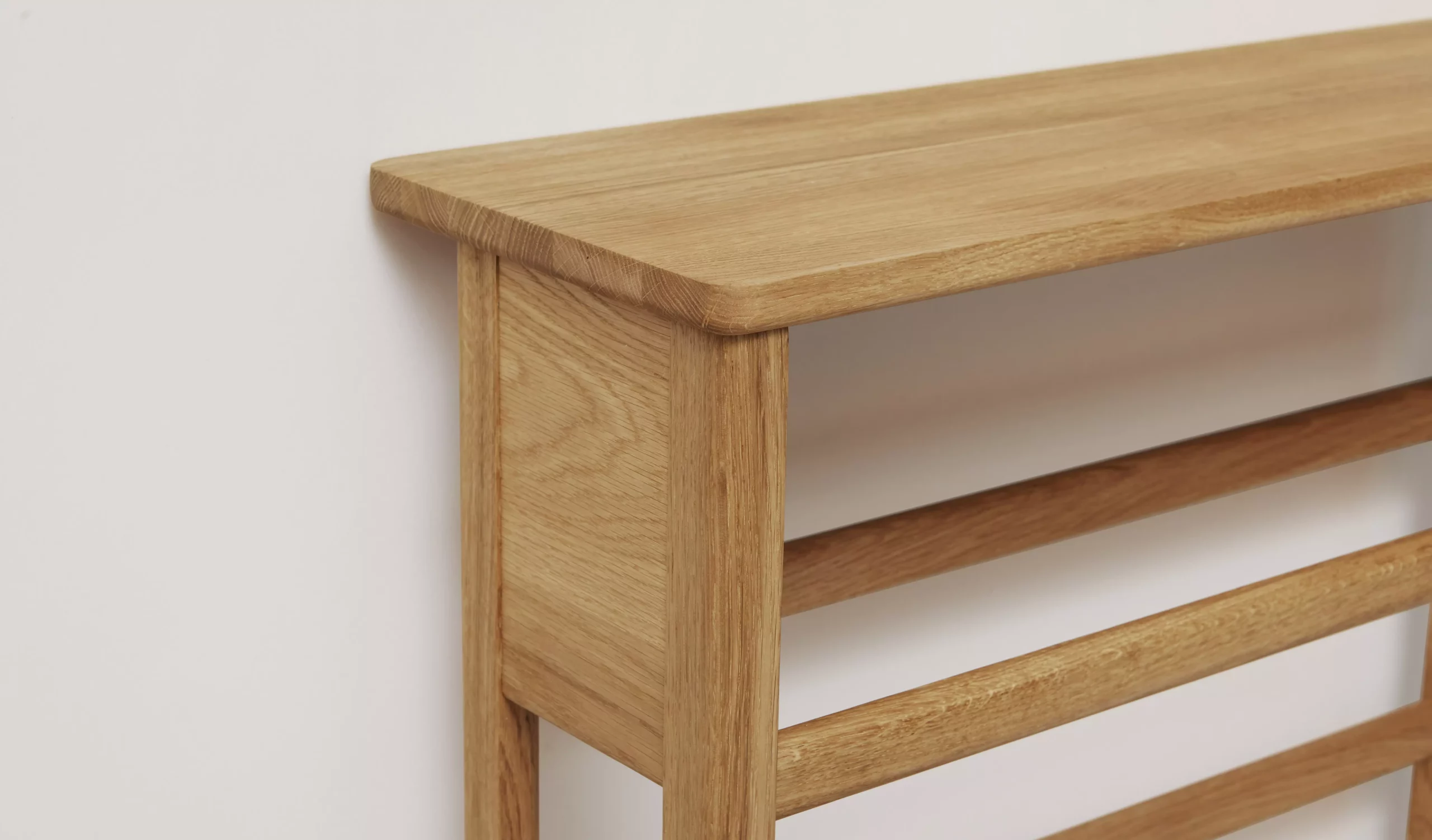 The A Line Shoe Rack is a small harmoniously designed combined shoe rack and console table that helps make the best use of the narrow space found in hallways, utility rooms or functional entrance halls. It is made of sustainable sourced oak of the highest quality and its contours are rounded carefully in line with artisan craft tradition.