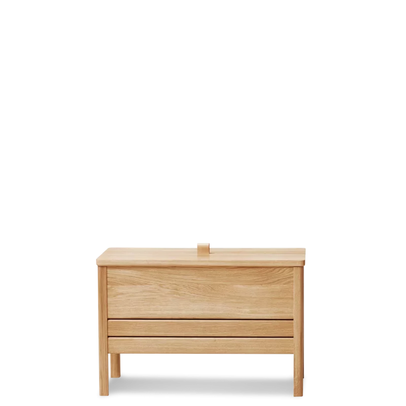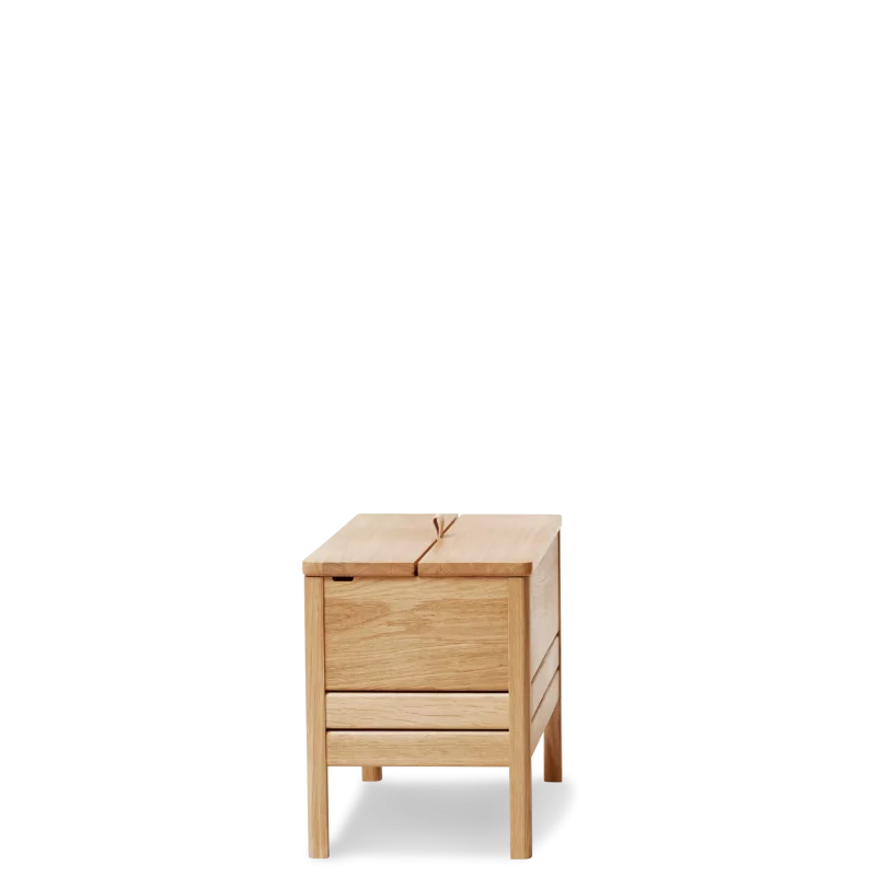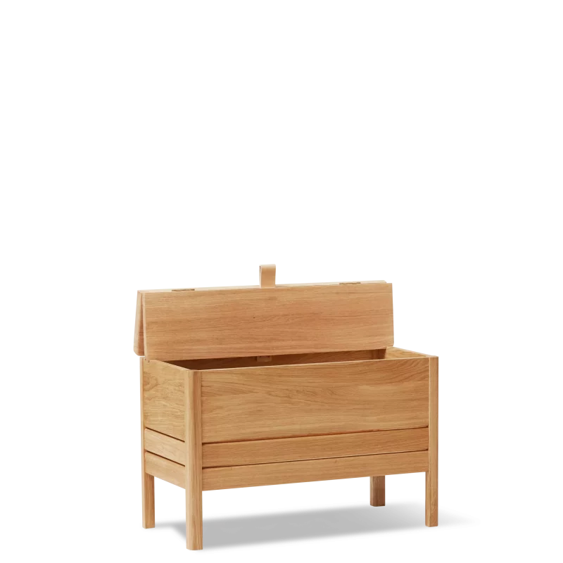 A Line Storage Bench is an updated version of the classic storage bench – where functionality meets clean form. A solid and versatile bench with slightly reduced dimensions and minimalistic characteristics. It is practical with a large area for storage. The lid is lifted with a small leather handle and is held in place by the construction when in use.