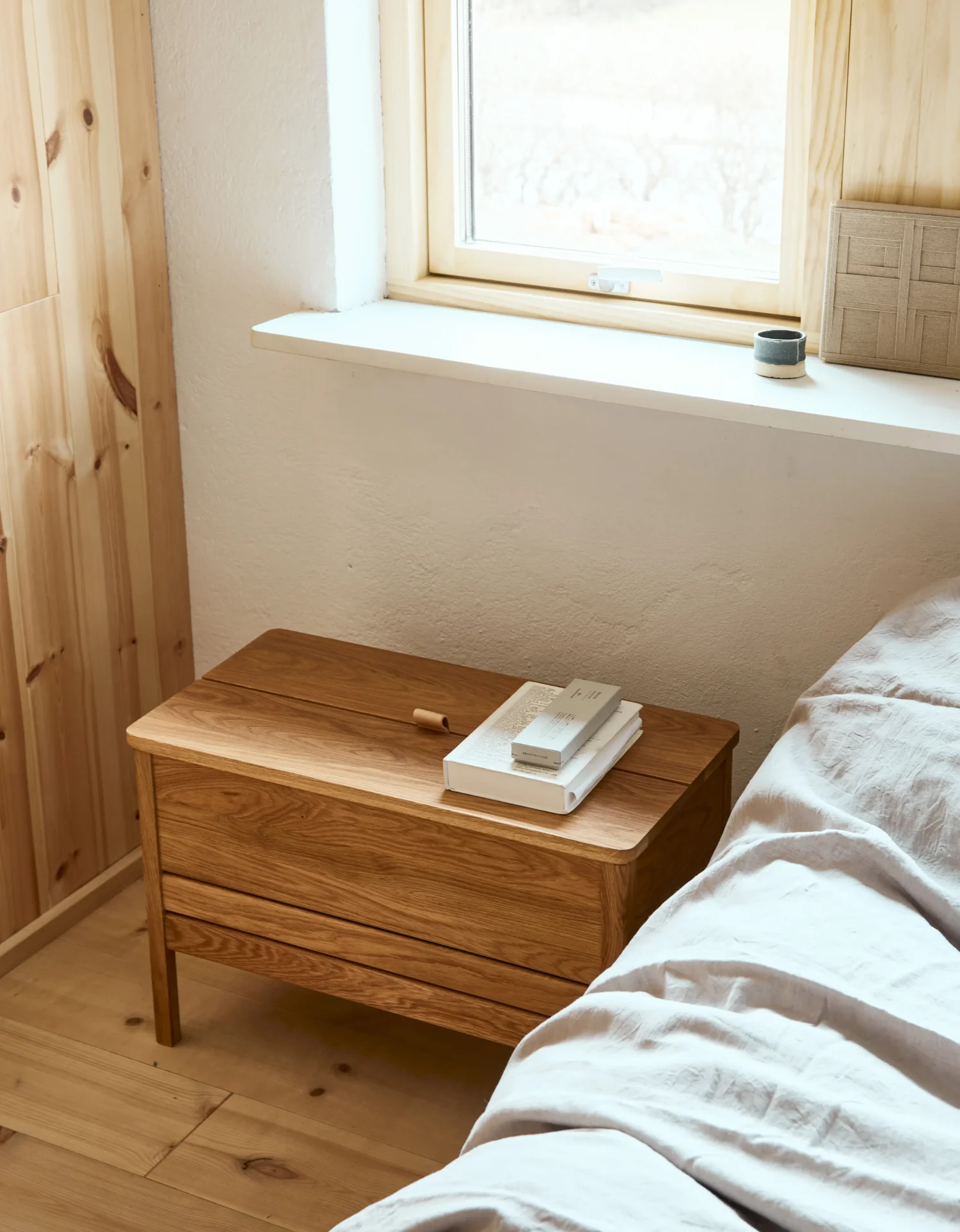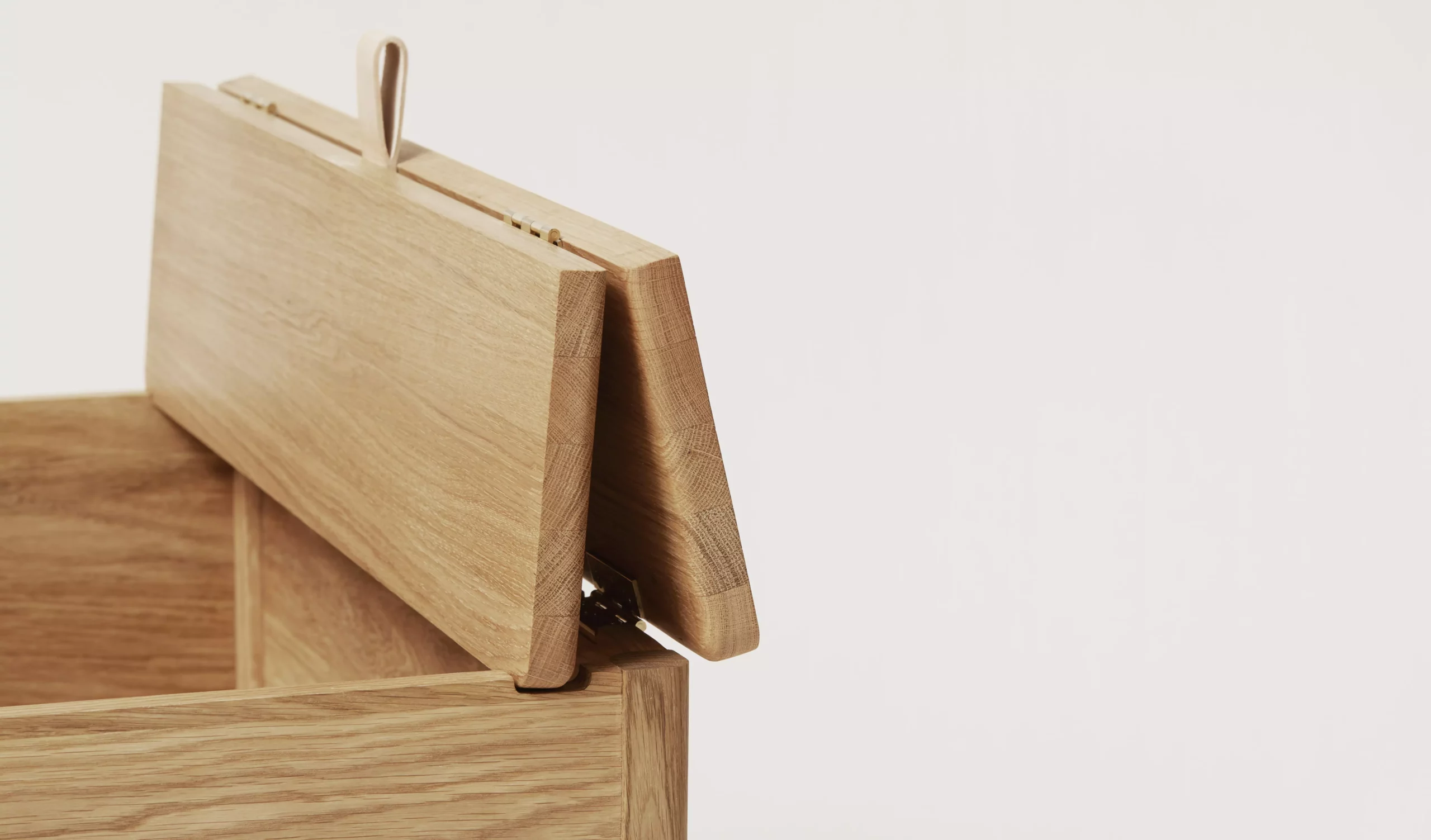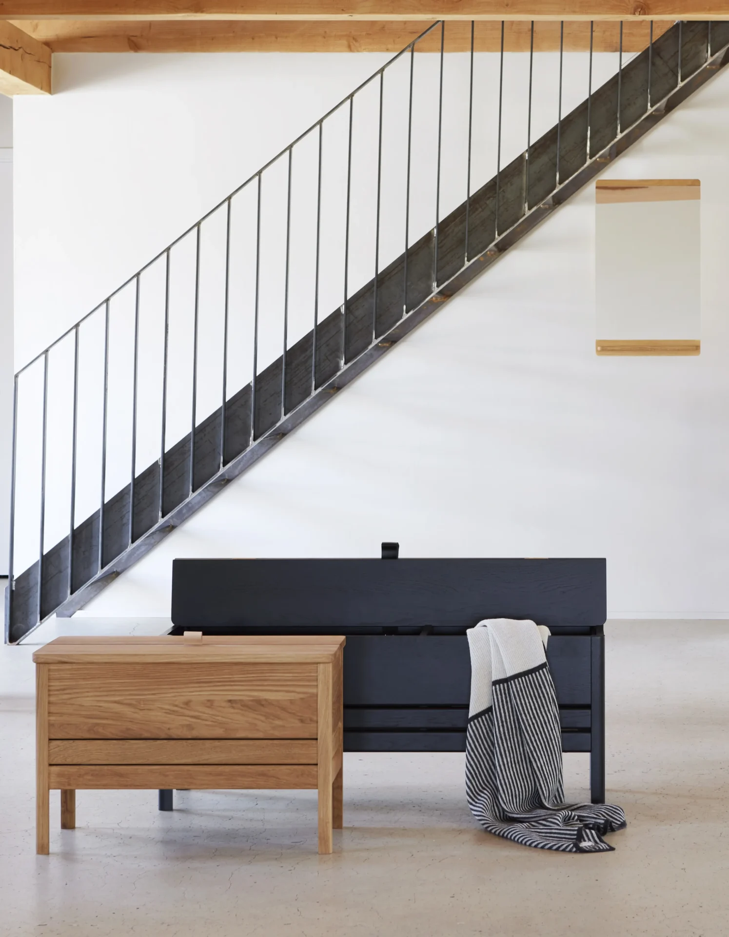 A Line Storage Bench is an updated version of the classic storage bench – where functionality meets clean form. A solid and versatile bench with slightly reduced dimensions and minimalistic characteristics. It is practical with a large area for storage. The lid is lifted with a small leather handle and is held in place by the construction when in use.