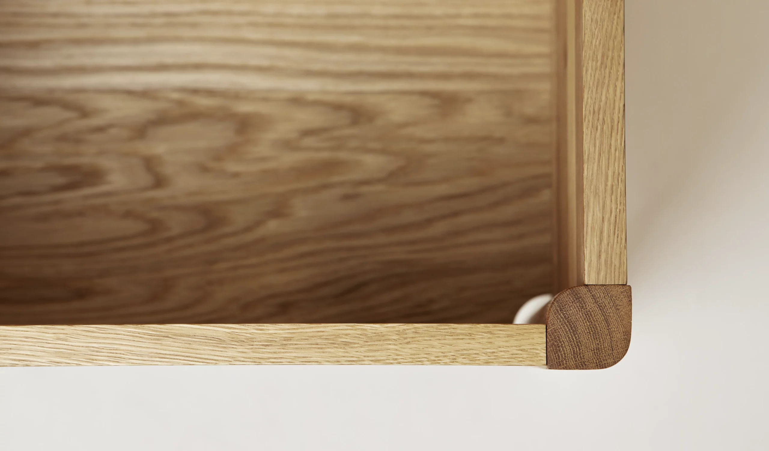 Materials: FSC®-certified Solid European Oak. Bottom: Veneer MDF. Natural Bend Leather
