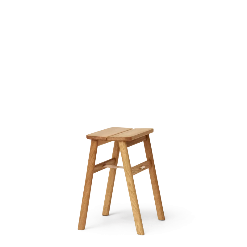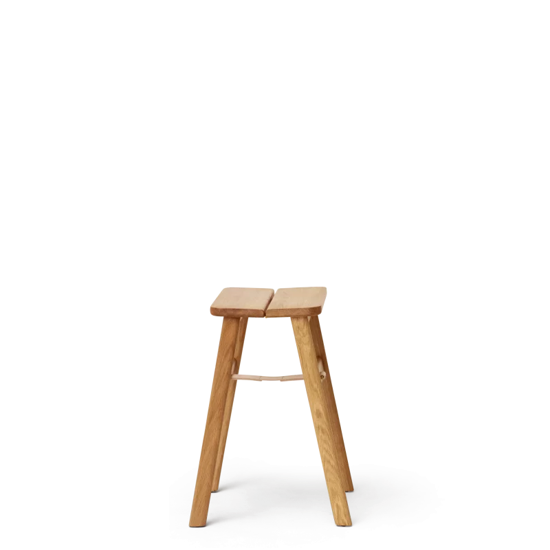 A stool that fits all needs and wants, whether the focus be upon form, functionality, comfort, or durability. The two sides of the seating base are angled 5 degrees towards each other. This unique design feature which facilitates surprising comfort for a stool making this an ideal choice for supplementary seating. The leather band beneath the seat has a supporting brass rod which gives the stool a final touch of detail and a prominent form. In all, a very durable item because of its solid wood and strong side beams.