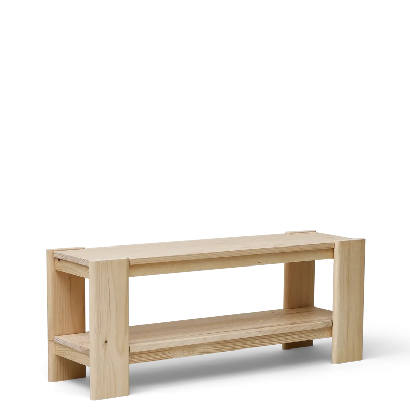 A handy and sturdy wooden bench for almost any home environment with a long practical shelf underneath for storing everyday items. The striking H-shaped end frames, which show off the beautiful grain of the pinewood, are joined to smoothly embrace the solid top.
