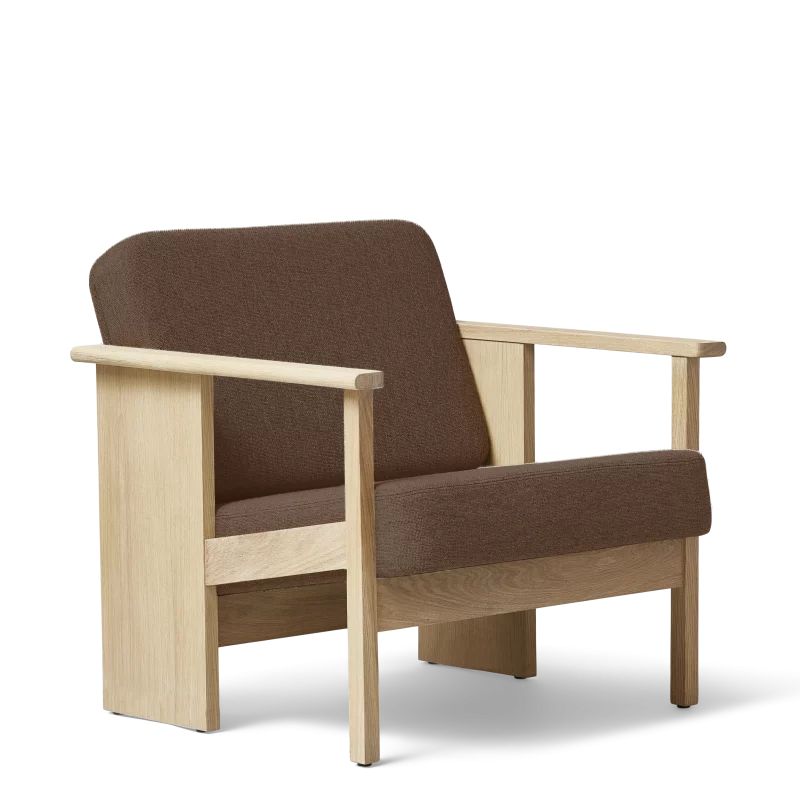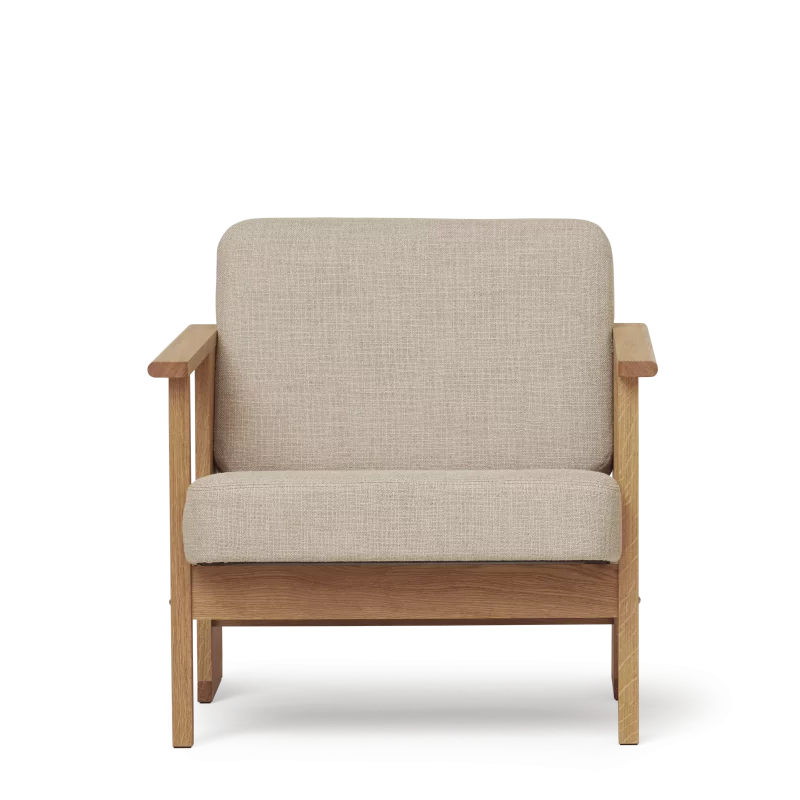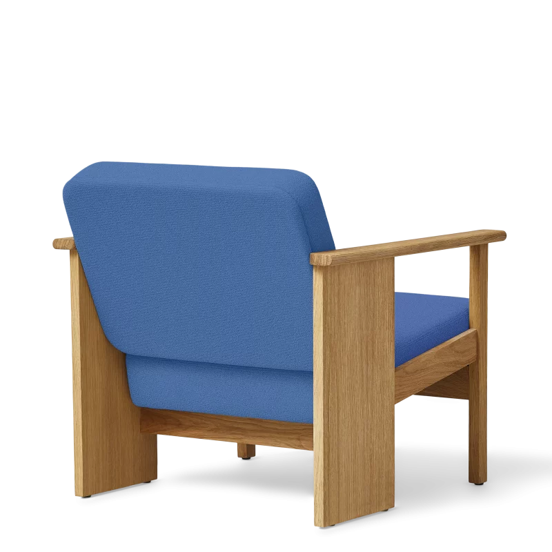 En kompakt lænestol med et markant træpanel og et tilbagelænet ryglæn med hørbetræk, som kombinerer rene og holdbare materialer med bløde ergonomiske former. Et fleksibelt møbel, som giver generøs komfort trods sit minimale miljøaftryk.