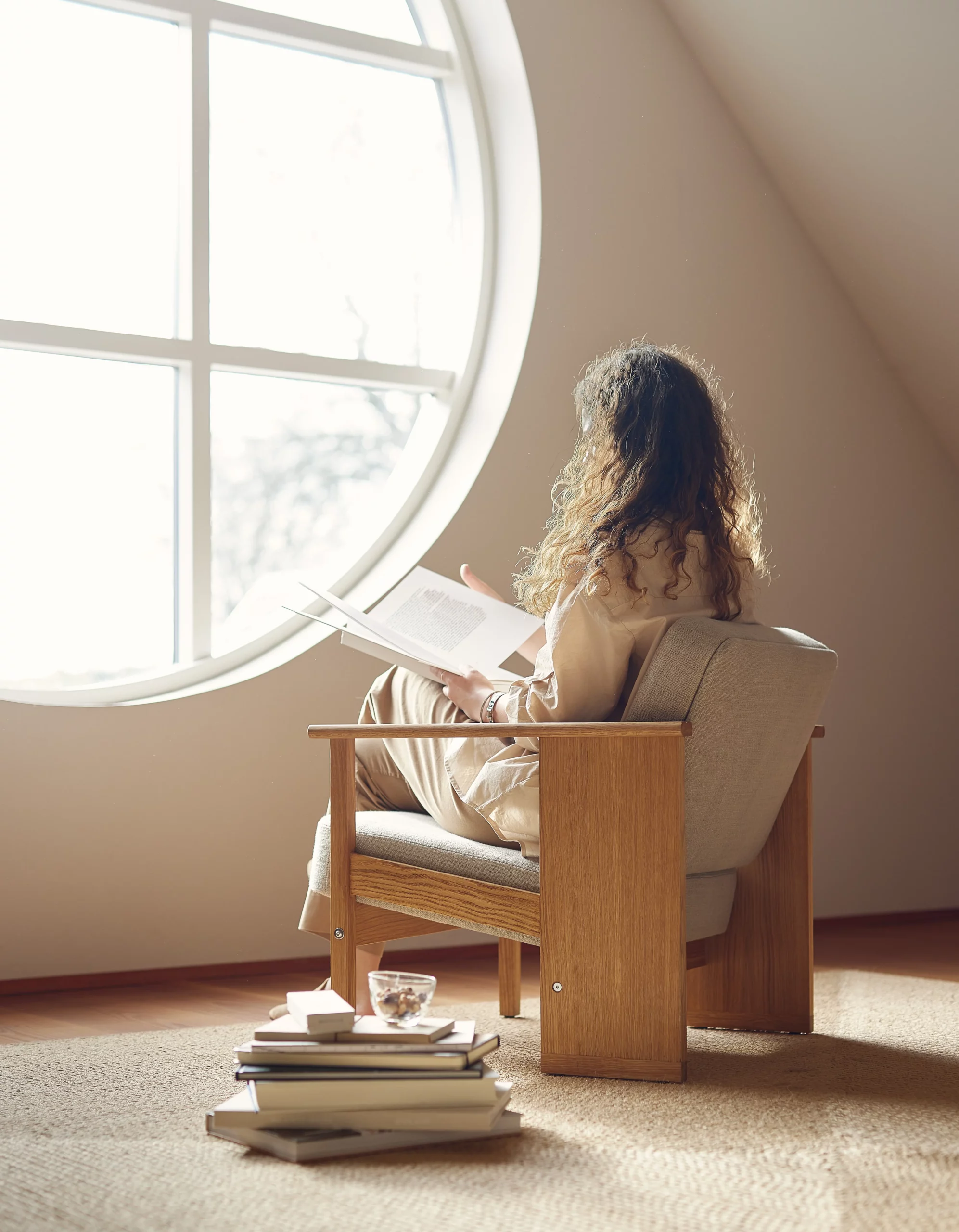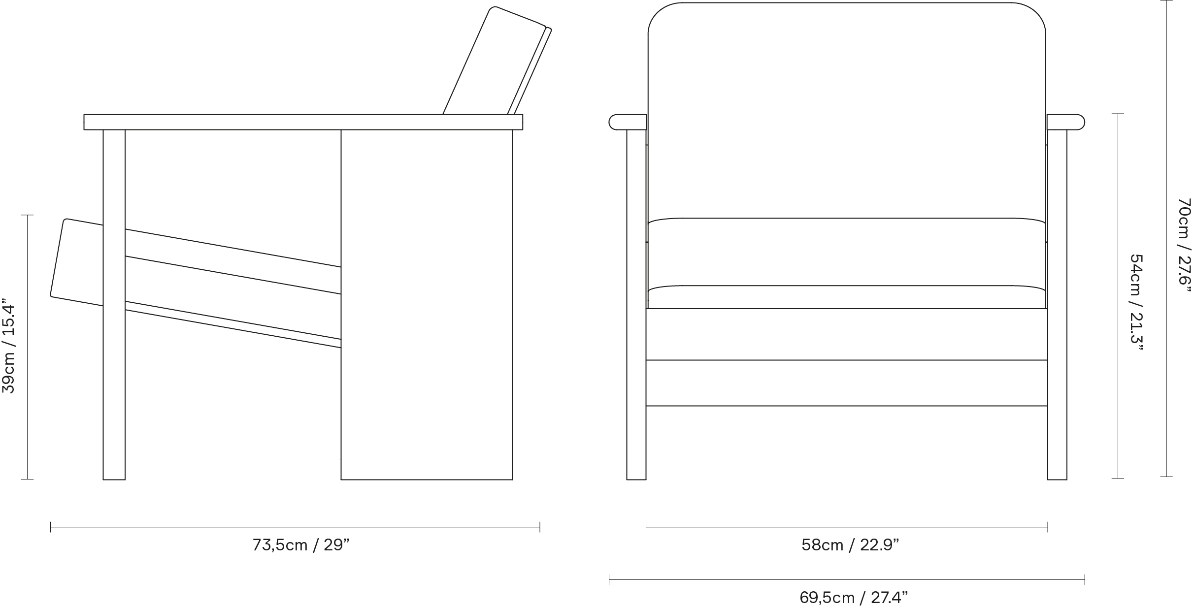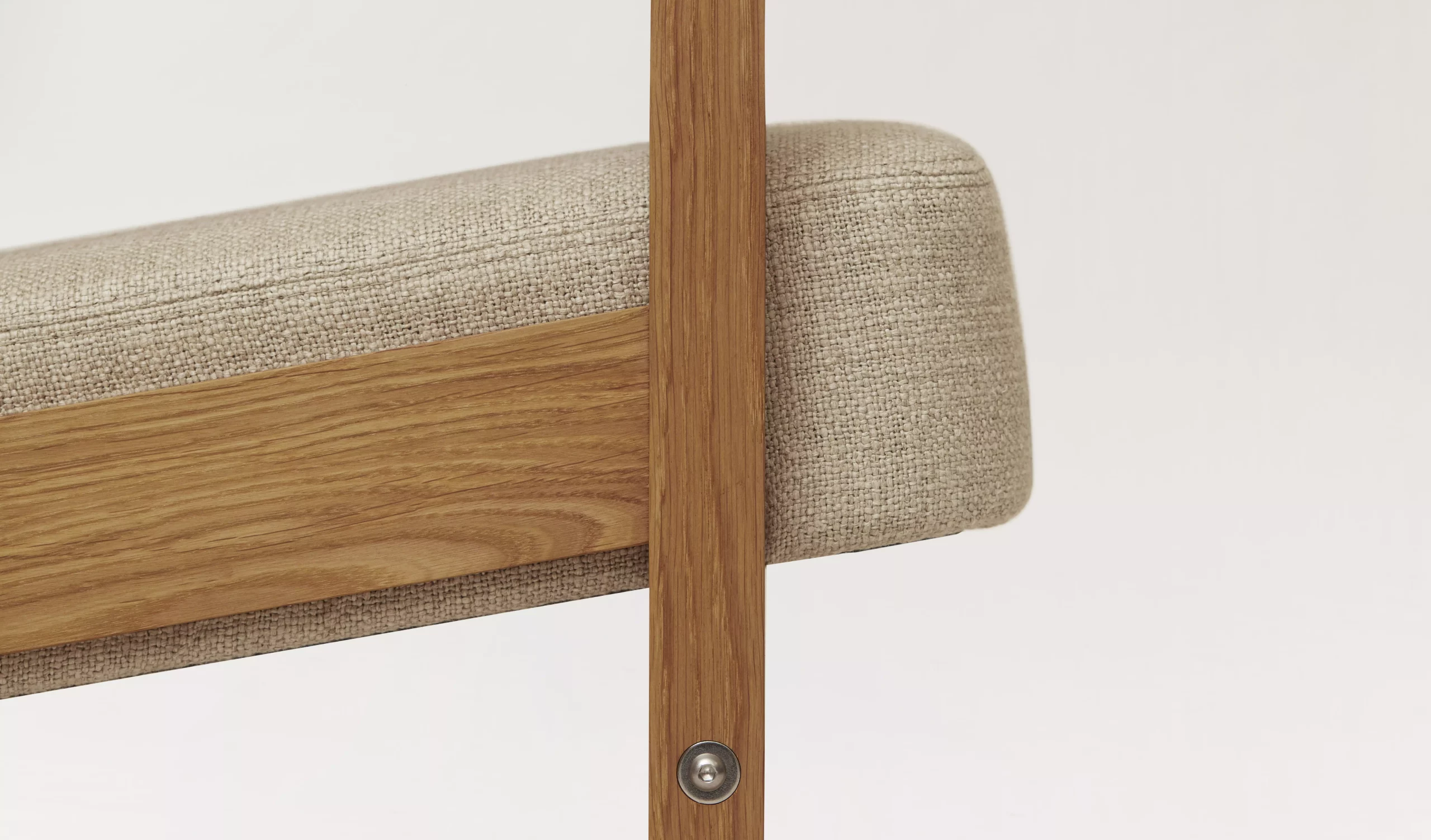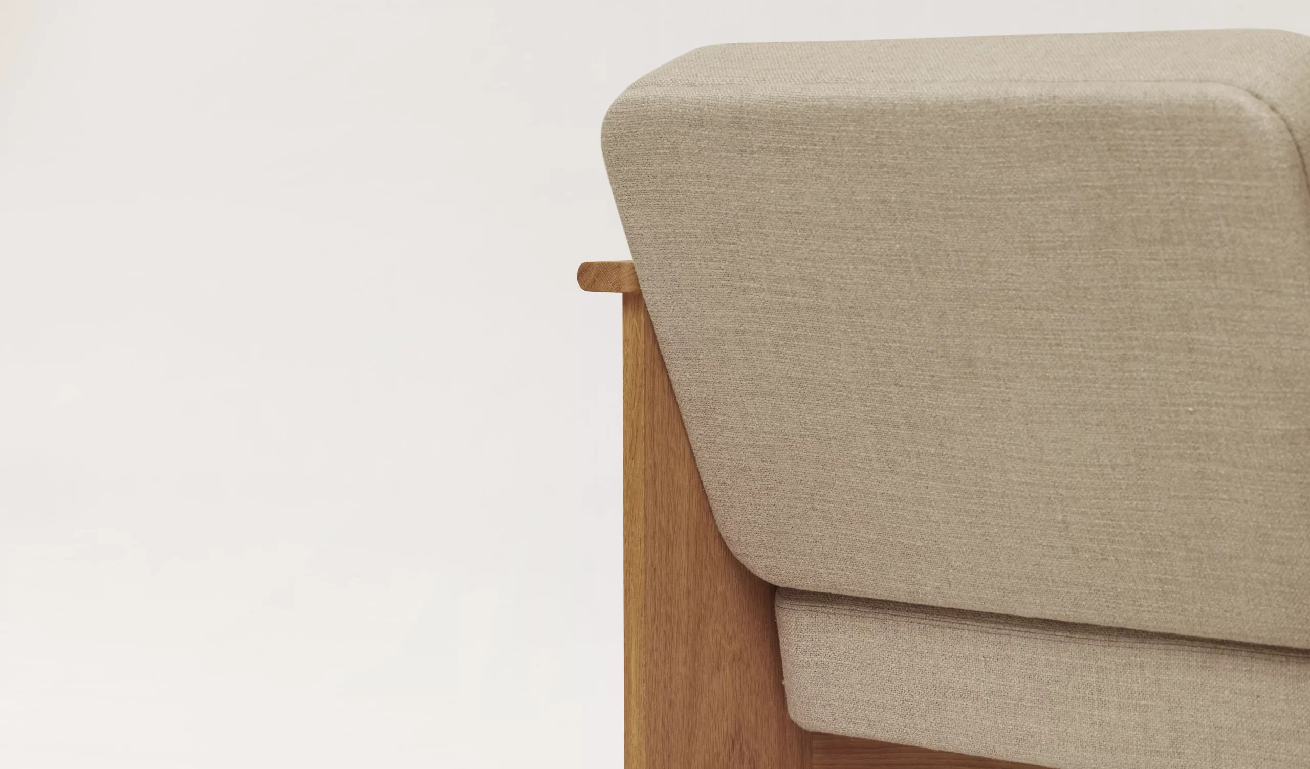 En kompakt lænestol med et markant træpanel og et tilbagelænet ryglæn med hørbetræk, som kombinerer rene og holdbare materialer med bløde ergonomiske former. Et fleksibelt møbel, som giver generøs komfort trods sit minimale miljøaftryk.