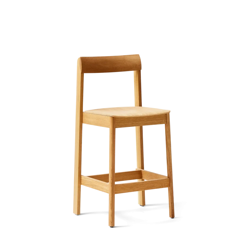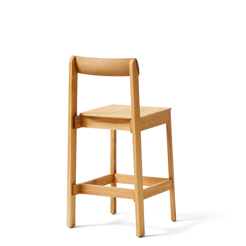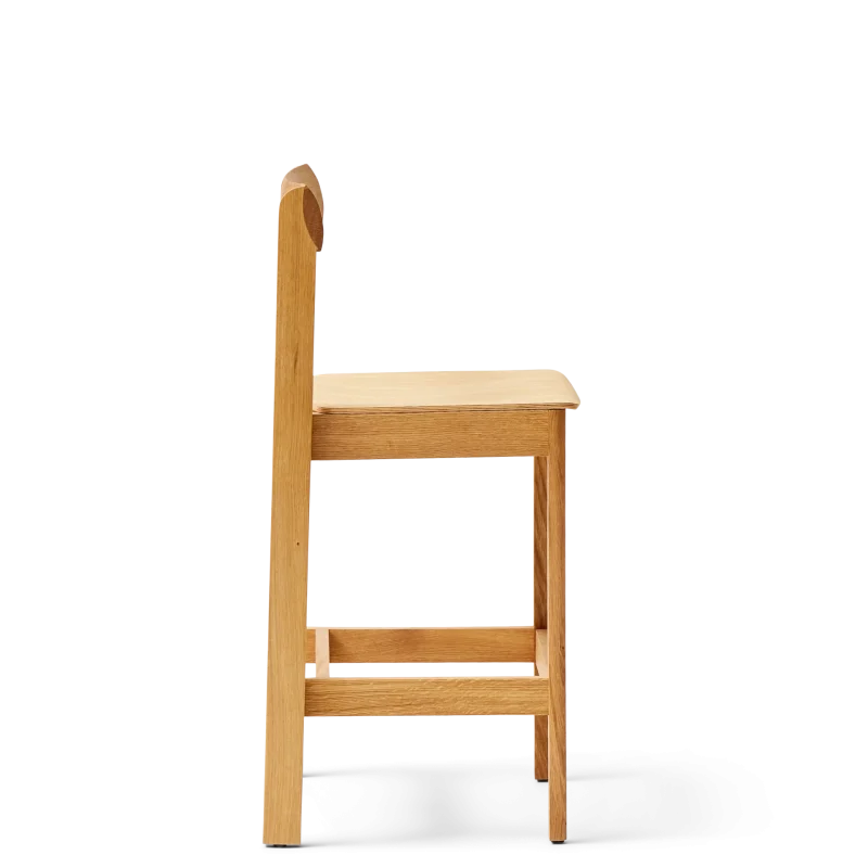The strong, solid legs combined with the veneer seat bring a surprising lightness and striking visual sharpness to the wooden bar chair, echoing the subtle elegance of the Blueprint Collection. The exquisite backrest is from a single piece of steam-bent oak.