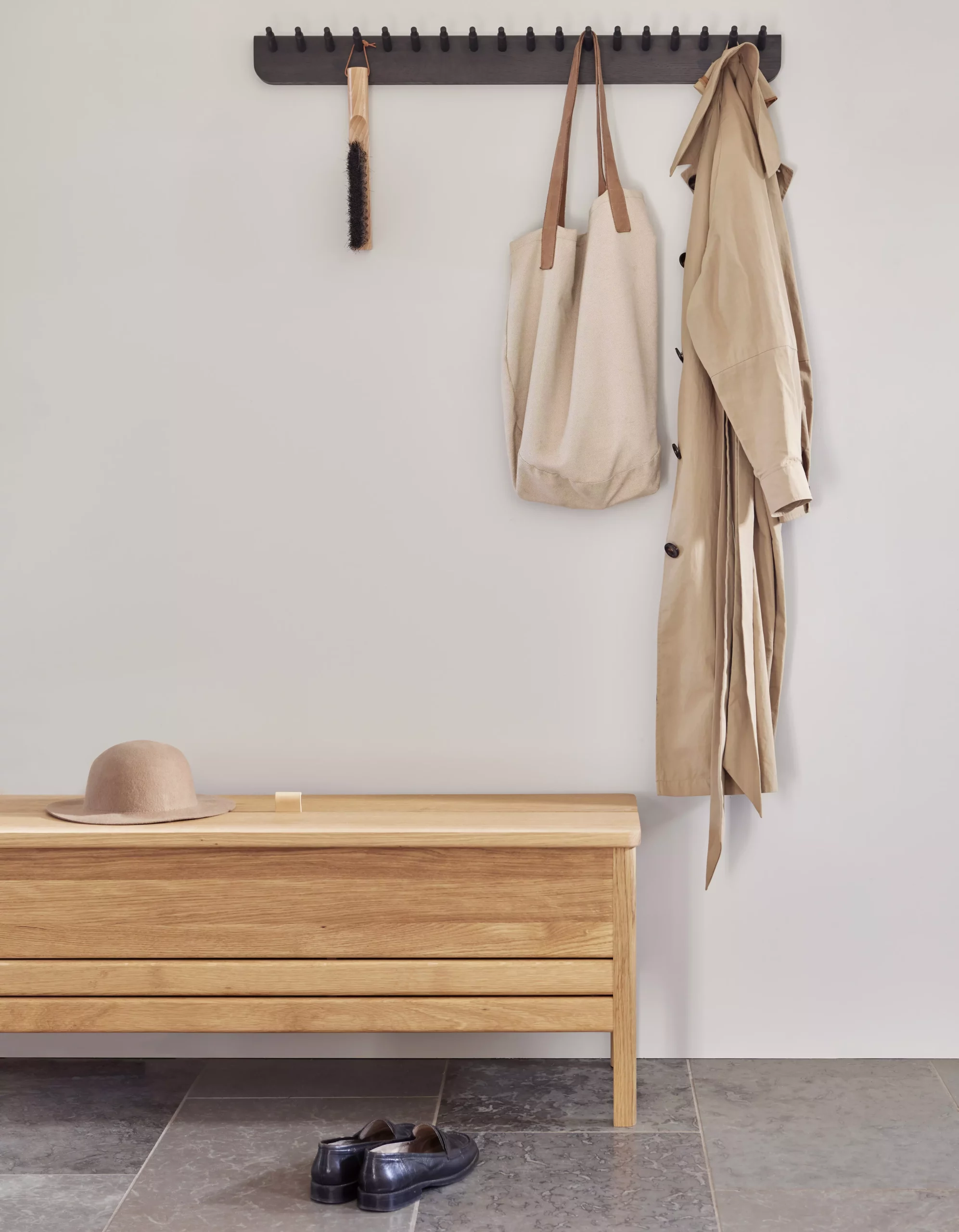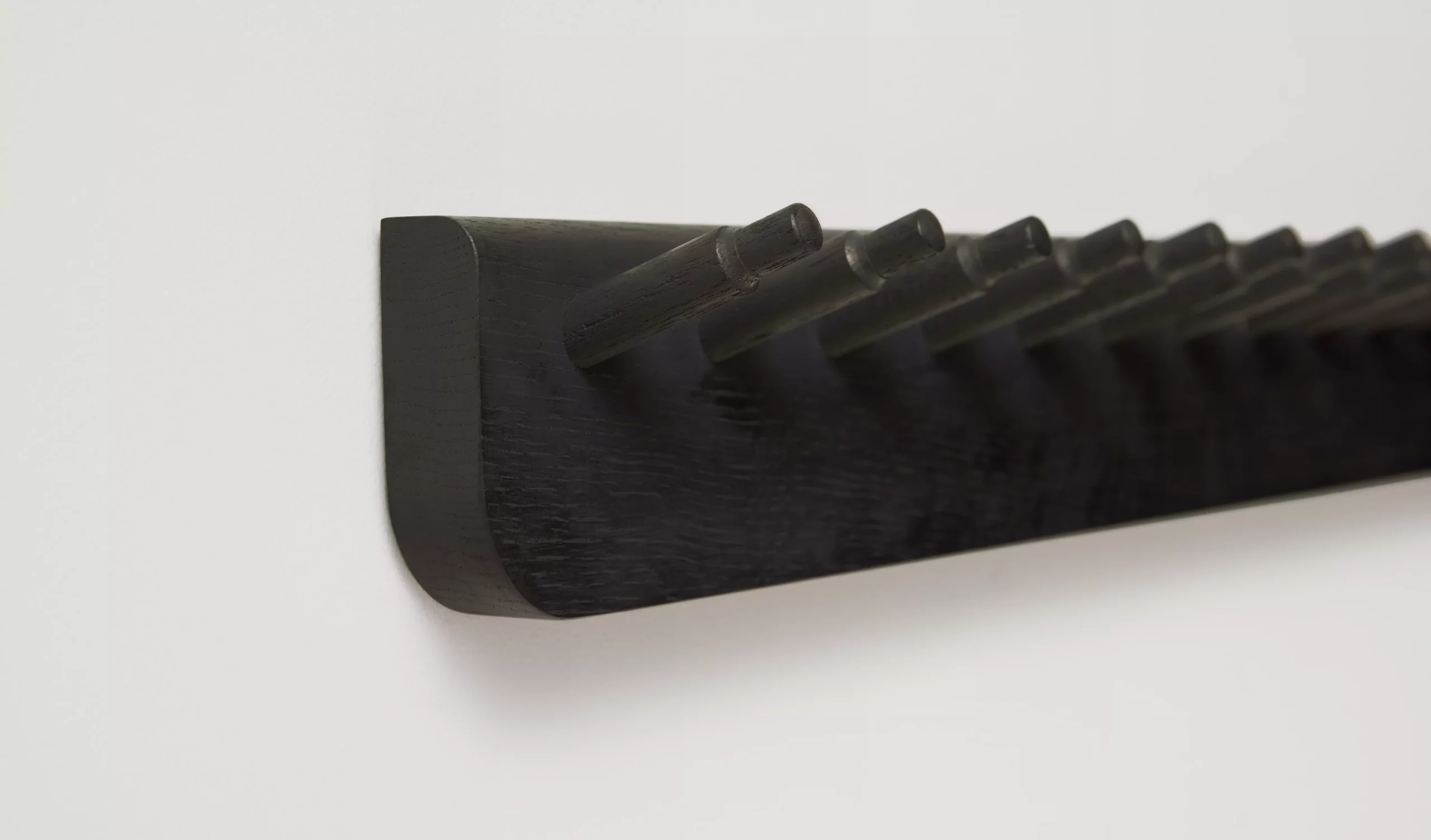 A flexible multi-purpose rack with a simple functional design to hang your coat, hat, or scarf in the hallway. The beauty of the framework and the formation of the pegs creates a structured design constituted by recognizable repetitions. The pegs are carefully detailed and have a curved form with a robust foundation. The sturdy and strong backrest provides durability and means that the coat rack can take considerable weight.
