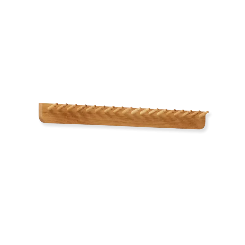 A flexible multi-purpose rack with a simple functional design to hang your coat, hat, or scarf in the hallway. The beauty of the framework and the formation of the pegs creates a structured design constituted by recognizable repetitions. The pegs are carefully detailed and have a curved form with a robust foundation. The sturdy and strong backrest provides durability and means that the coat rack can take considerable weight.