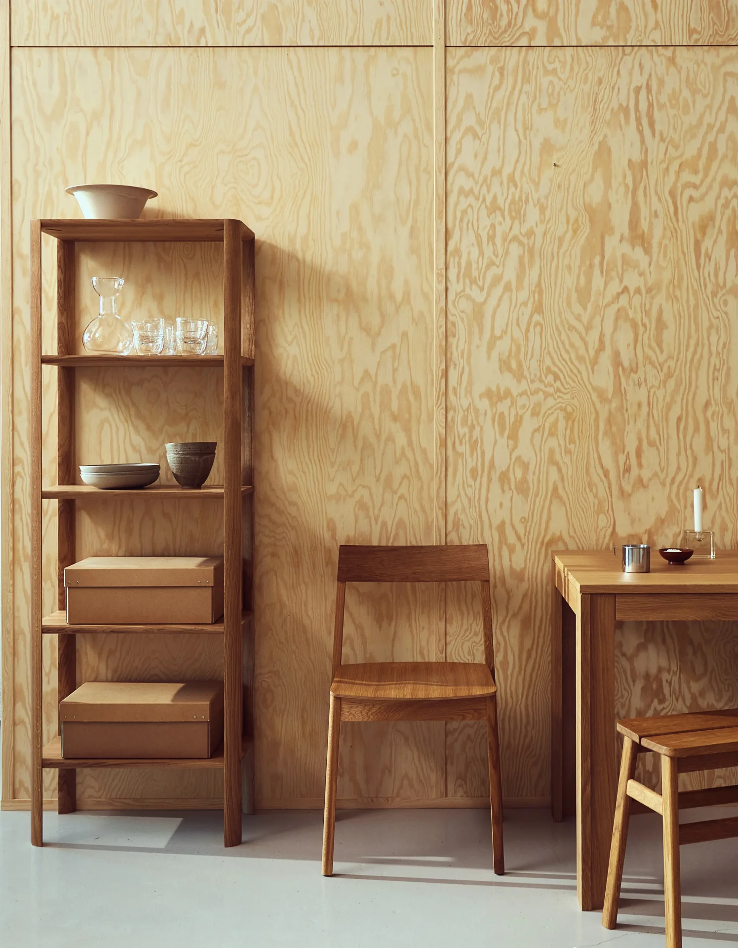 The Leaf Shelf is an attempt to create a shelving system that strikes the ultimate balance between aesthetic, stability and packability. It is characterised by a very pure aesthetic that aims to make the column legs the centre of attention. With an organic and clean expression, sculpted in the shape of a leaf, they give the system its signature look. The construction itself is also ground-breaking in terms of stability, as it is entirely contained, without any visible screws or other stabilising parts under the shelf.