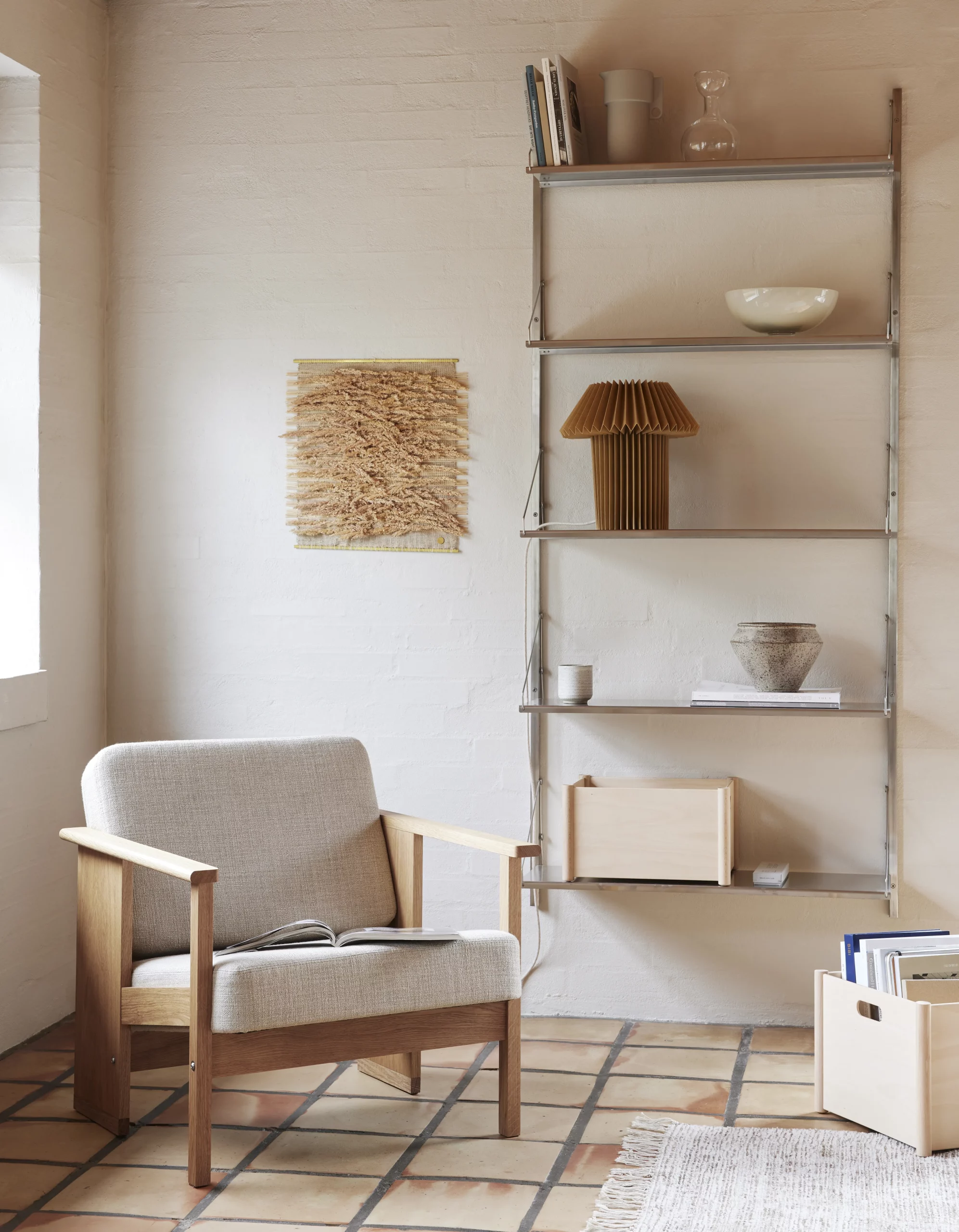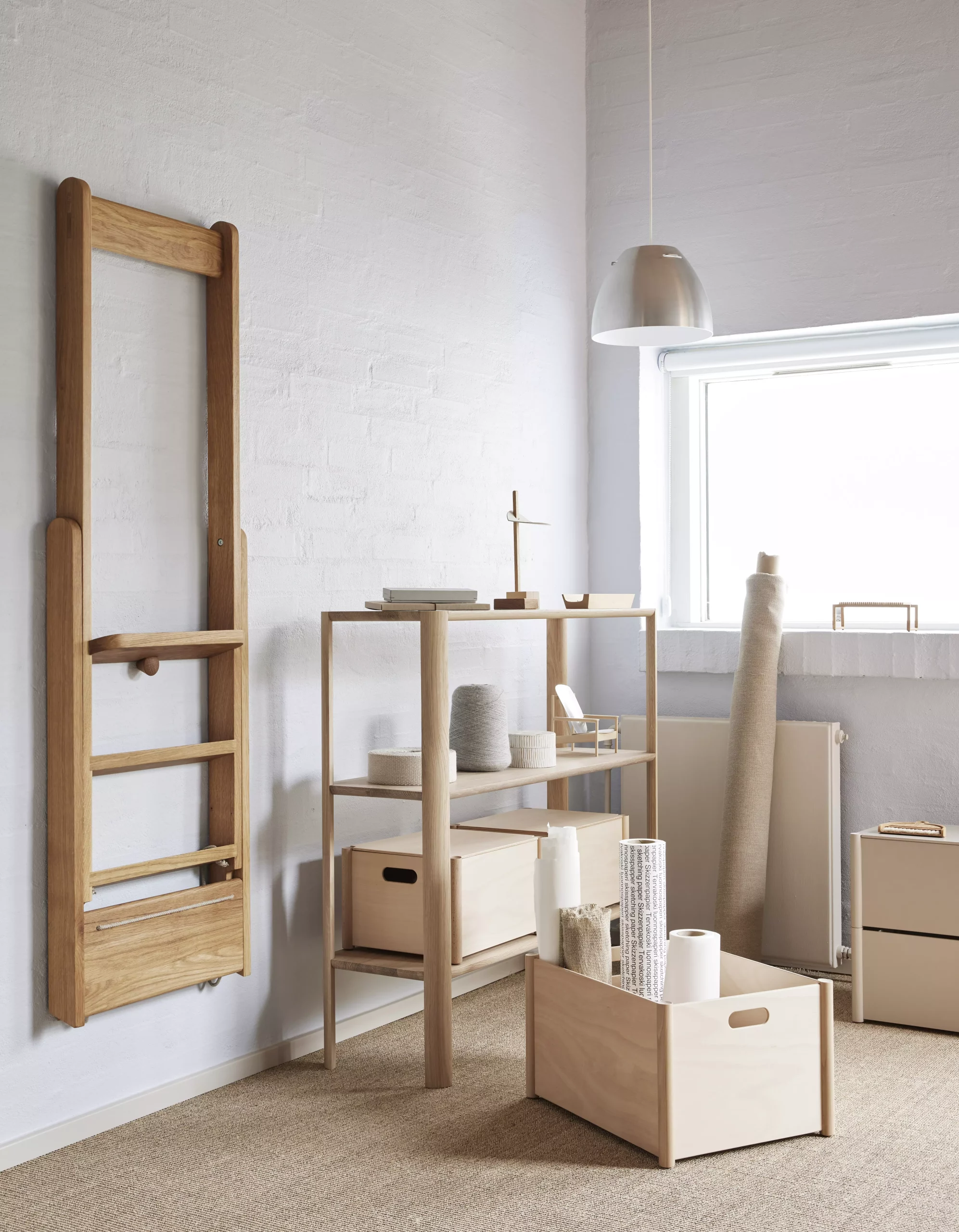 The Pillar Storage Box Medium fits neatly onto the Form & Refine Leaf Shelf.