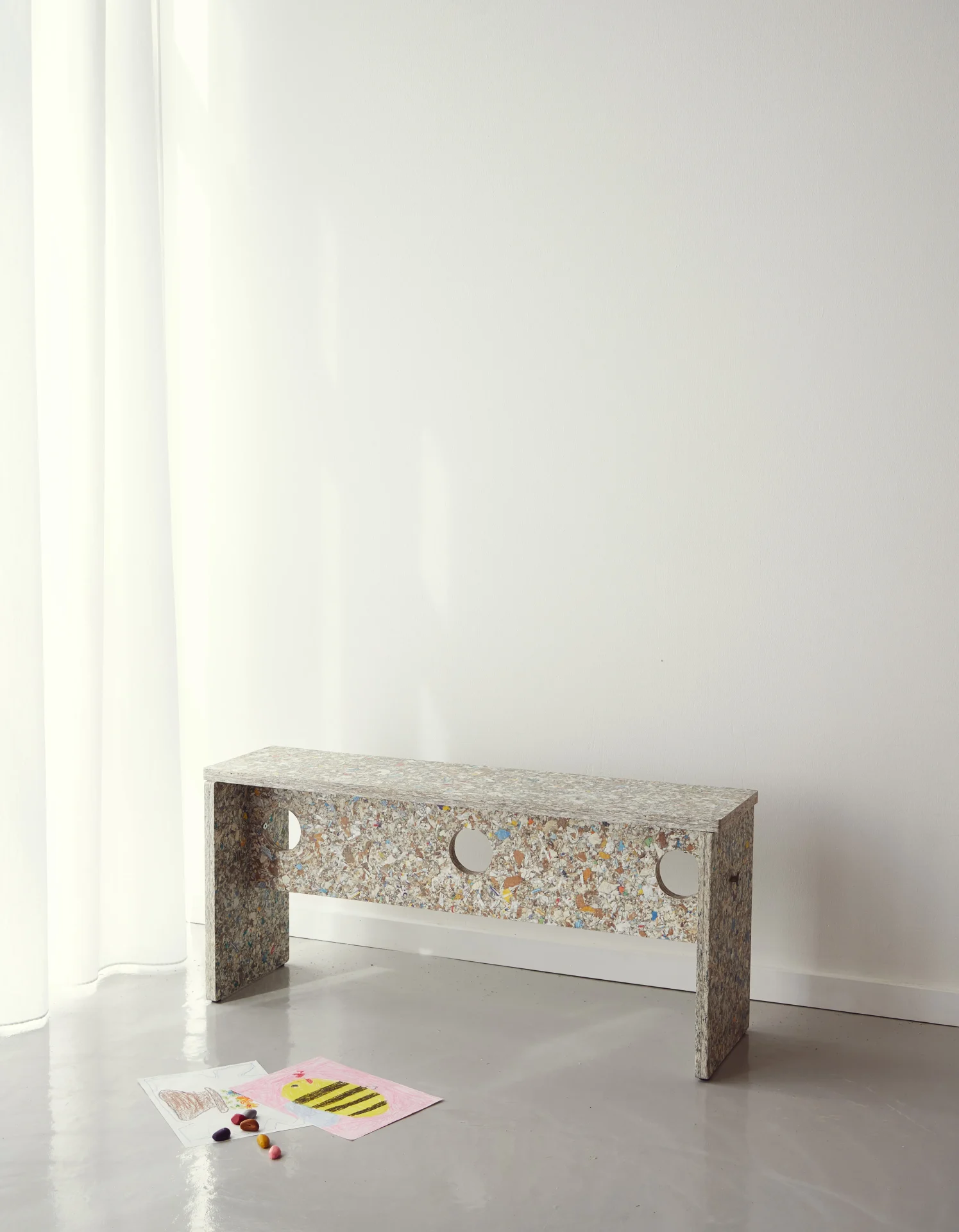 The Remake Bench is produced using Pack Wall Design Board from Recoma, a fully circular material made from recycled beverage cartons. This unique process allows paper, plastic, and aluminum to be repurposed again and again, reducing waste and minimizing environmental impact.
