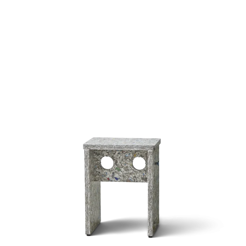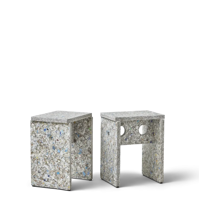 The Remake Stool is produced using Pack Wall Design Board from Recoma, a fully circular material made from recycled beverage cartons. This unique process allows paper, plastic, and aluminum to be repurposed again and again, reducing waste and minimizing environmental impact.