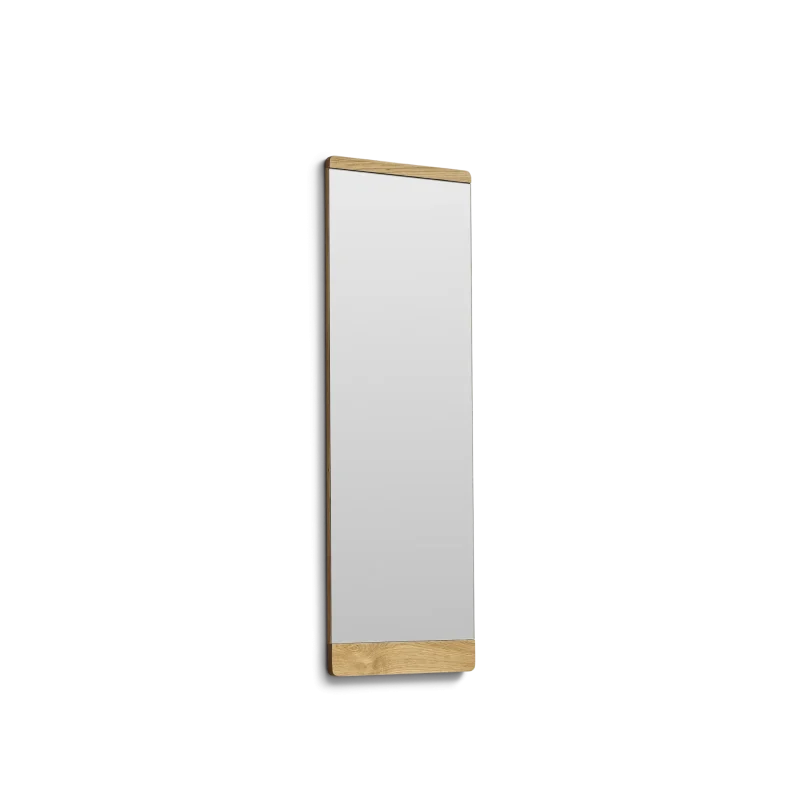 ”We wanted to make a classic and slim mirror with visible soft wooden details that lift it from the wall. The flat panels at the top and bottom give the mirror a warm expression as the wood grain becomes visible. The wooden strips that surround the back of the mirror all have a large radius which creates a soft shadow on the wall”