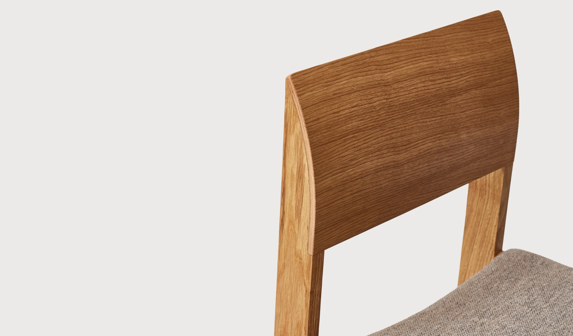 Sonder is a chair that offers high comfort with its long, curved backrest and soft, flat, U-shaped seat. The Sonder chair is characterised by a touch of Brutalism, with its sturdy legs and crossbars. This is combined with a fresh and exciting use of finely curved veneer on the seat and back.