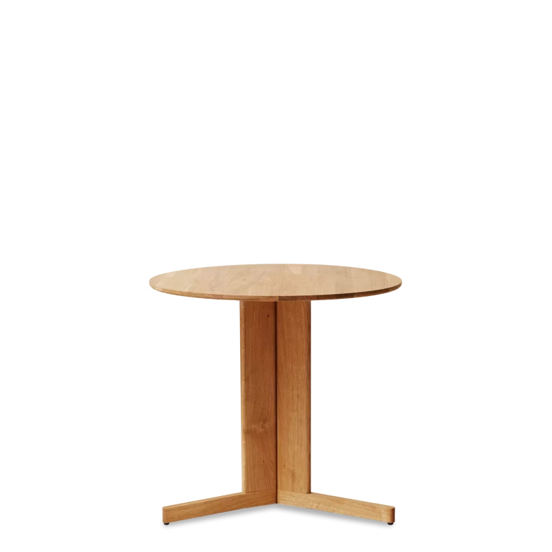A centre point of free-floating solid oak elements hold the round table in place, creating a contradiction of lightness and substantiality. The free space of the three legs adds to the lightness and special visual complexity of the table. The three legs make it possible to sit around the table in comfort with much more space for each user.