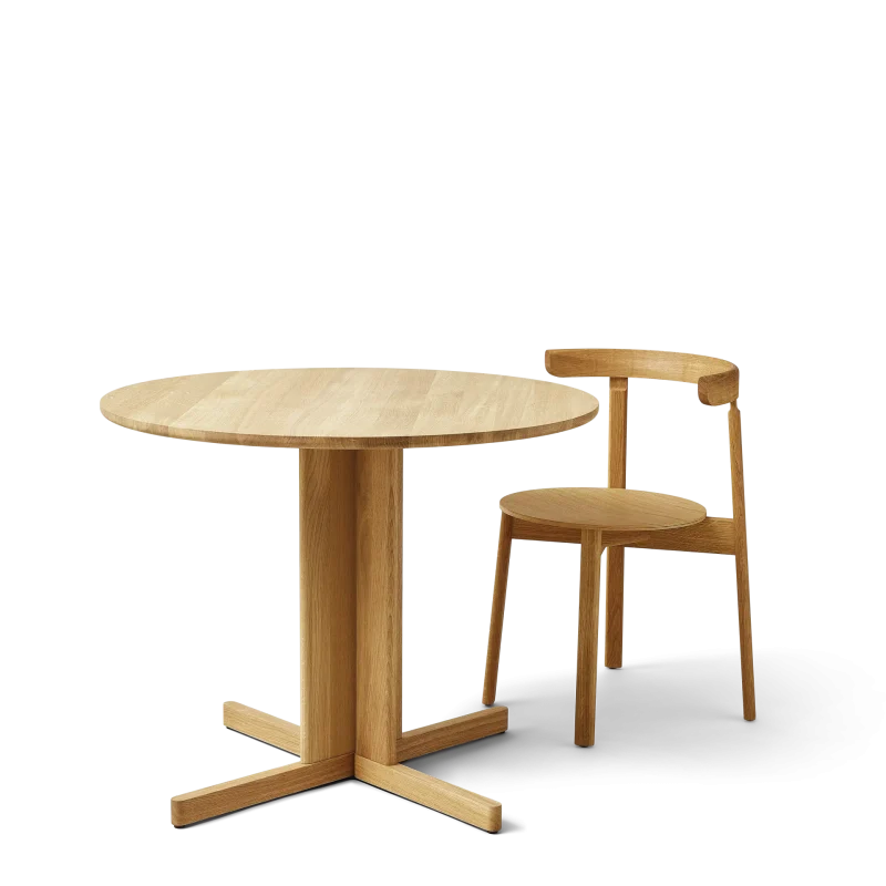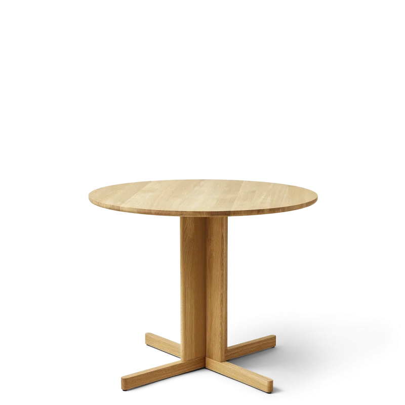 A centred column of elegant solid oak elements supports the round designer table, creating an apparent contradiction of lightness and substantiality. The small gaps in between the segments of the column add to the elegance and visual complexity of the wooden table. The centred legs make it possible to sit around the table in comfort with much more leg room for everyone. The table is equally perfect for a home environment or a hospitality setting.