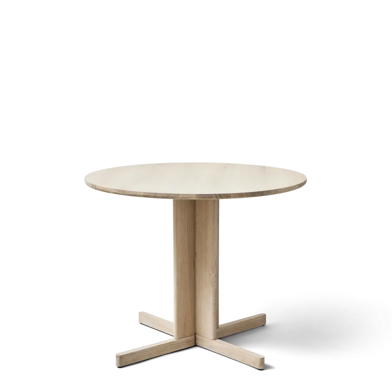 A centred column of elegant solid oak elements supports the round designer table, creating an apparent contradiction of lightness and substantiality. The small gaps in between the segments of the column add to the elegance and visual complexity of the wooden table. The centred legs make it possible to sit around the table in comfort with much more leg room for everyone. The table is equally perfect for a home environment or a hospitality setting.