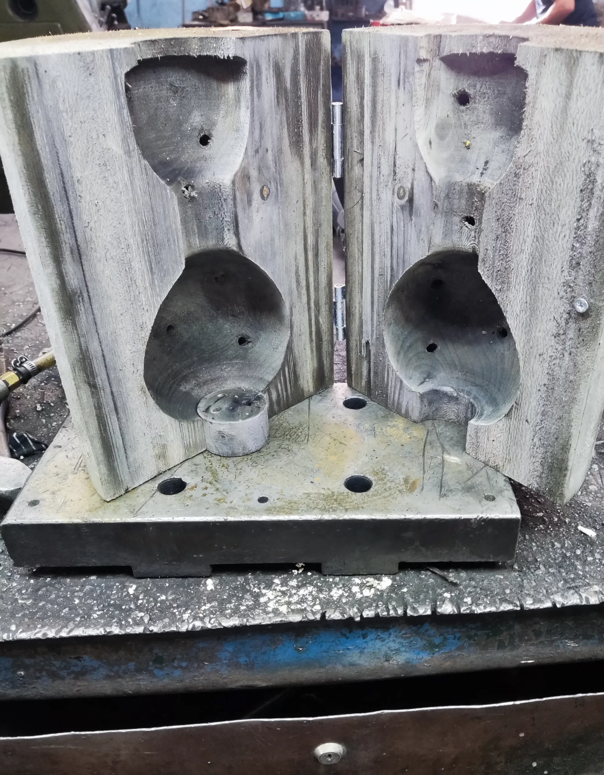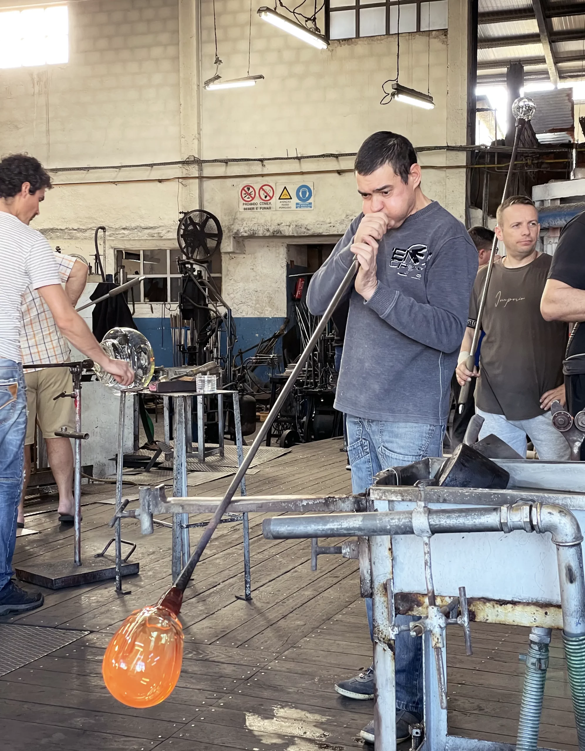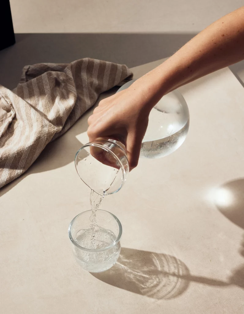 Pinho has a geometric design expression and is mouth-blown into an aluminium mould. The glass is heated to 1,200 degrees Celsius before it is blown into the mould by an artisan glassblower. Next, the mould is opened, and the glass is removed while it is still hot and cut off at the top. This technique, called hot-cutting, is optimal for symmetric shapes with a flat base. Because our glass and carafe have an asymmetrical top, the use of the technique is more demanding, but we use it because it produces a more rounded edge, which makes the glass nicer to drink from. The finished form cools in a series of carefully controlled stages to prevent inner tensions that could crack the glass.